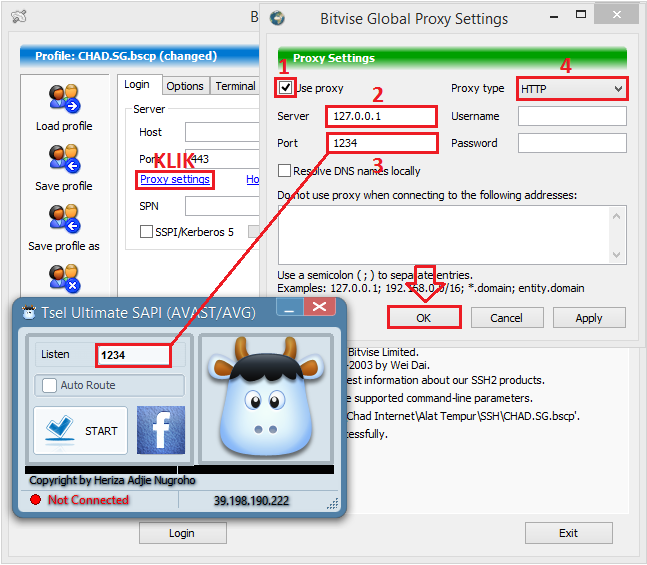 3. KLIK Proxy setting lalu isi lalu centeng Use oroxy, isi Server dengan 127.0.0.1 dan pada pengisian Port harus sama dengan Listen Port yang ada pada inject kemudian pilih Proxy type HTTP setelah itu klik OK. Perhatikan gambar.