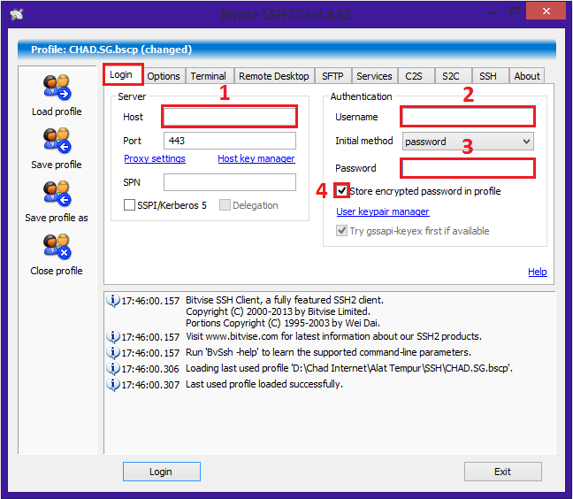2. Agan isi Host SSH Client dengan Host yang agan punya atau yang telah dibeli dari Seller SSH. Kemudian agan isi Username, Password sesuai dengan account SSH agan dan centang pada Store encrypted password in profile. perhatikan gambar dibawah ini.