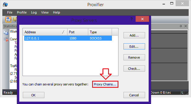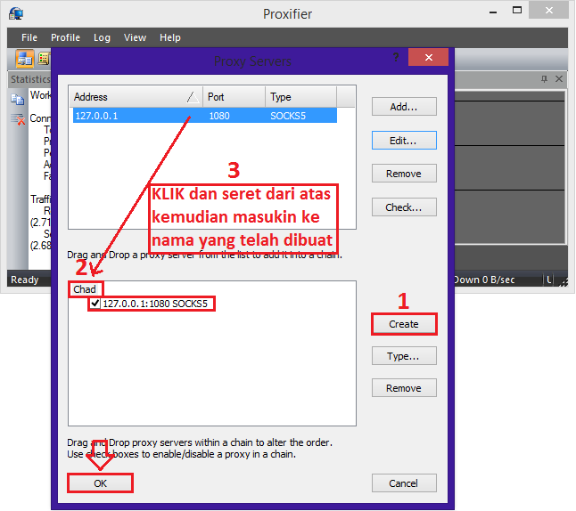 7. Setelah Proxy Chains di klik maka akan muncul tampilan seperti gambar dibawah ini. Disini agan klik Create lalu bikin sebuah nama terserah agan kemudian agan klik adress yang ada di sebelah atas dan seret ke nama yang barusan agan bikin selanjutnya klik OK.