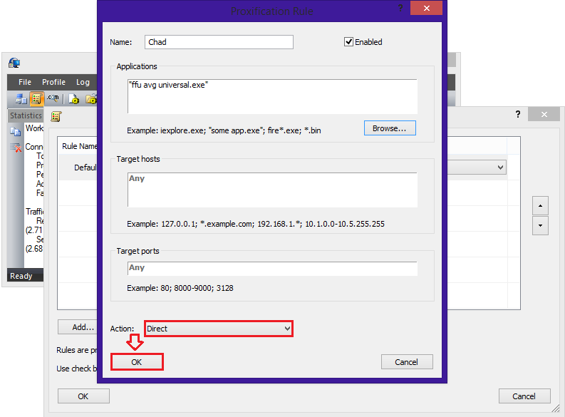 13. Klik default lalu pilih Action nya Proxy SOCK5 127.0.0.1 kemudian klik OK. Lihat gambar.
