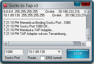 Langkah pertama sudah aku jelasin diatas bahwa kita harus login SSH dulu. Selanjutnya setelah SSH suuces login kita buka Socks To Tap (S2T) nya dengan cara klik kanan dan pilih Run As Administrator kemudian klik Start pada S2T tersebut tunggu hingga statusnya Tersambung (Perhatikan gambar dibawah ini).