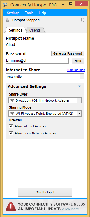 Setelah Connectify Hotspot Pro di start maka tampilannya akan seperti ini: