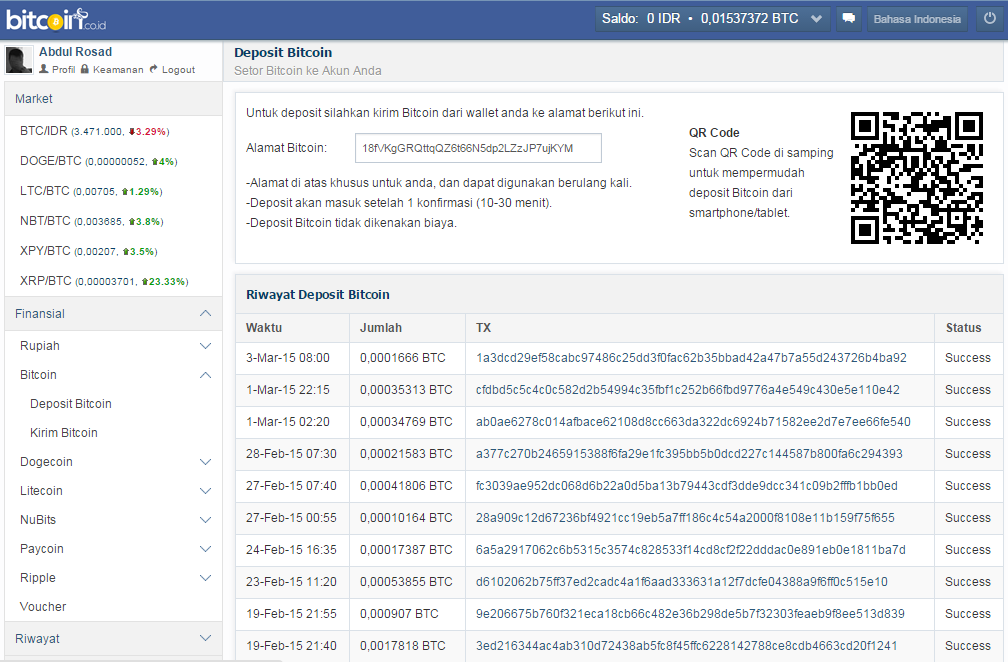 5. Setelah mendaftar silahkan login disitu kemudian klik Finansial, klik Bitcoin, dan klik Deposit Bitcoin. Disitu nanti akan muncul Barcode dan alamat (Adress Bitcoin). Dan silahkan copy alamat bitcoin sobat.